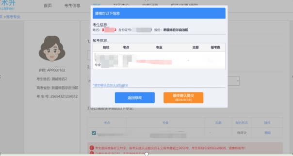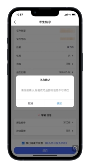 完善基本信息,首先在考生信息页面选择考生类型为:高中生,选择后需要填写考生信息,完成后点击提交,提交时会有弹框提示您再次确认填写的考生信息是否正确,提交成功后信息不可修改,考生确认无误后点击确定提交。 提交成功后会有考生信息保存成功的弹框提示信息。接下来需要按照提示去上传报考资料。